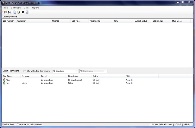 This is the main screen for the call centre application. The top half of the screen displays the list of all open calls, sorted by the date that the call needs to be closed by. The bottom half of the screen lists the technicians as loaded in the data base.